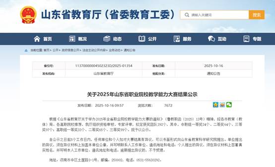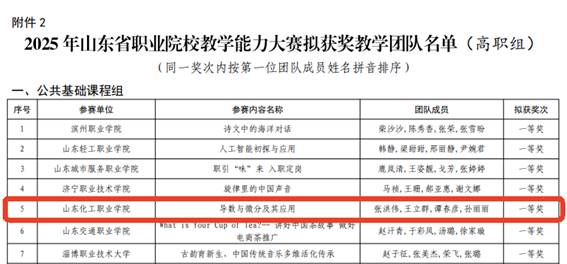 近日,山东省教育厅对山东省职业院校教学能力大赛结果进行公示,我校共有四支教学团队获奖,其中《导数与微分及其应用》教学团队获公共基础课程组一等奖,《化工火灾事故智能管控与应急》教学团队获专业课程二组一等奖,《流体智能输送操作与安全控制》获专业课程一组二等奖,《绸韵出海:非遗丝绸短视频视觉营销设计》获专业课程一组三等奖,首次实现一等奖的突破。
